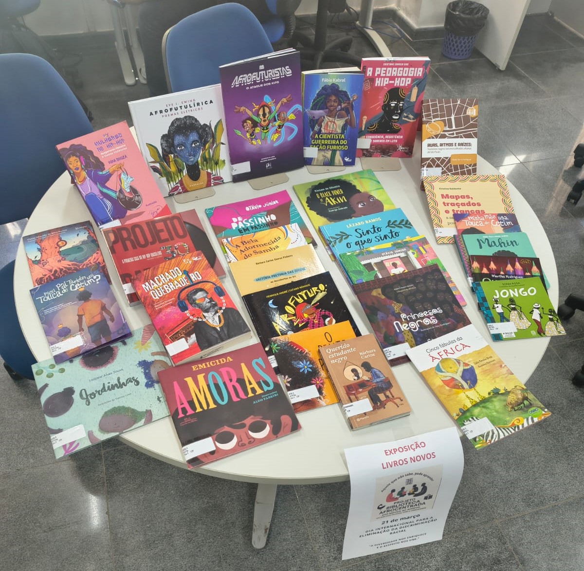 Em alusão do dia 21 de março de 2026 dia de combate a discriminação racial. A Biblioteca do IFSP aproveita a data para expor os títulos adquiridos pelo projeto do PROAC, sendo expostos aproximadamente 120 títulos com 230 exemplares, as obras vão desde literatura infantil à literatura afrofuturista e formação docente, todas são de autoria negra.